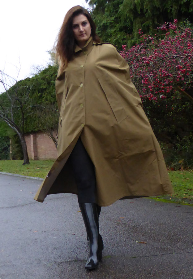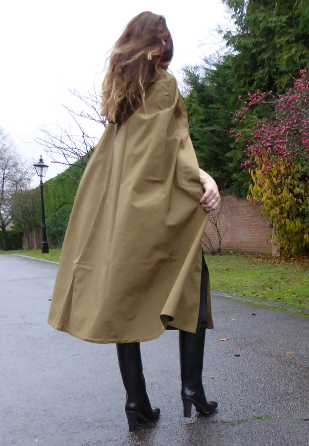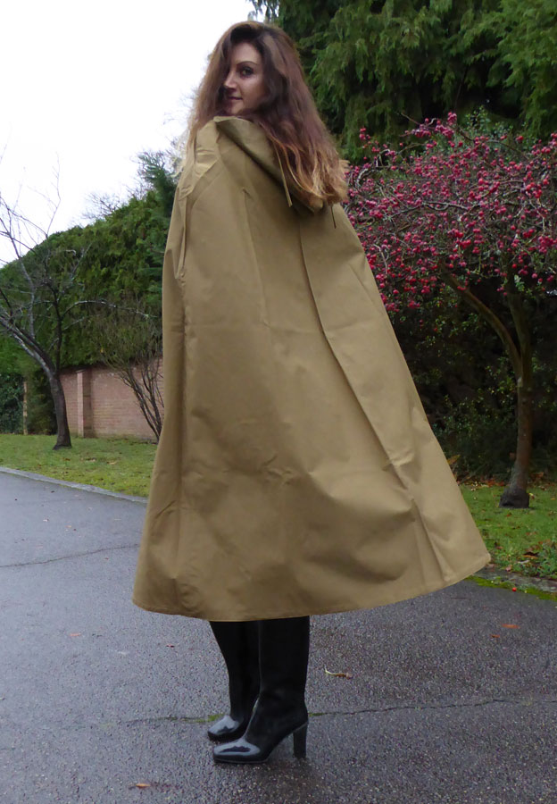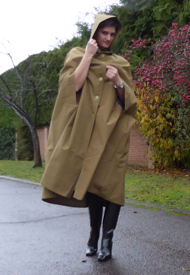A lovely waterproof cape, which is crafted in single texture rubber-lined iridescent cotton bright yarn, in a distinguished shade of old gold.