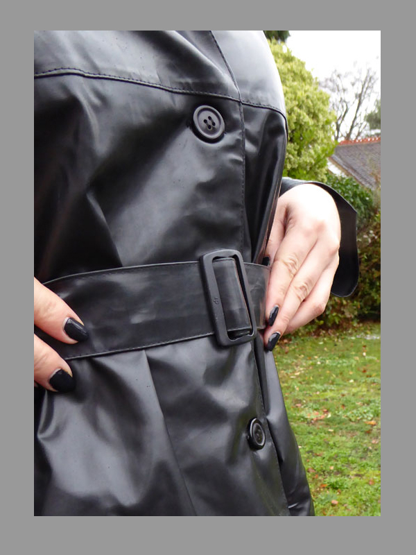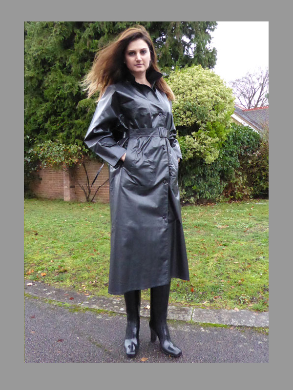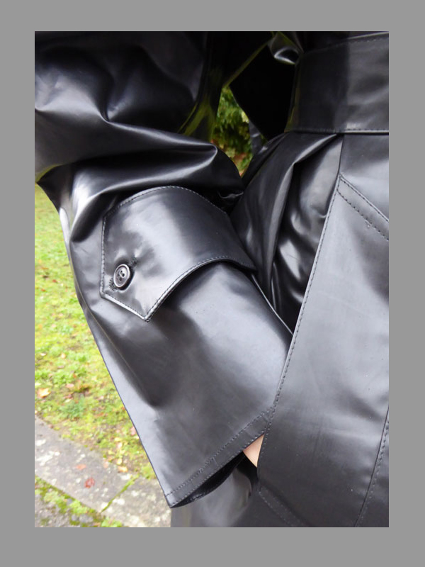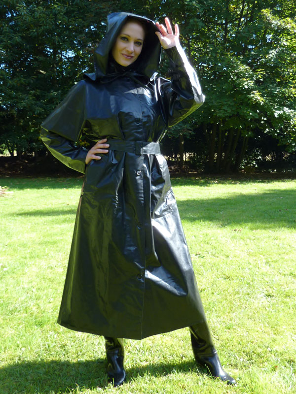 The ‘Danielle’ waterproof single-breasted mackintosh, handmade in the United Kingdom, using skills that have been honed over centuries. Dramatic protection in shining black, glossy rubber outer surface on black cotton lining. Cut in the Dolman style of the 1960s, to give comprehensive waterproofing. A large drape hood which is detachable, and of double thickness to give an attractive face framing ‘turn-back’.